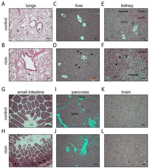 - Benson, J.M.; Gomez, A.P.; Wolf, M.L.; Tibbetts, B.M.; March, T.H. The acute toxicity, tissue distribution, and histopathology of inhaled ricin in Sprague Dawley rats and BALB/c mice. Inhal. Toxicol. 2011, 23, 247–256. [Google Scholar] [CrossRef]