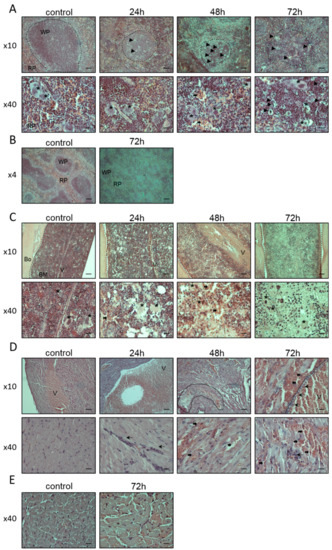 2.4. Cellular Alterations in the Spleen, Bone Marrow, and Heart of Ricin-Intoxicated Mice