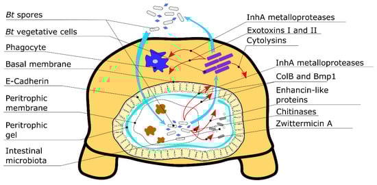 Bt minor virulence factors produced on different stages of its life cycle and their respective targets. The figure depicts a schematic cross-section of an insect larva body; denoted are the Bt virulence factors and their modes of actions.