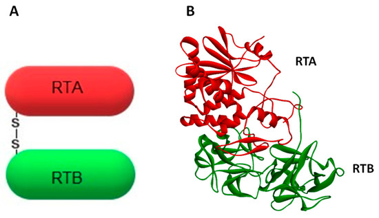 In the 19th century, Paul Ehrlich proposed the “magic bullet concept”, which states that drugs can directly enter target cells and hit only abnormal cells of the human body [264]. Since then, the idea of a selective action of drugs that are able to affect only specific types of cells has been dynamically developed. However, the specificity of this process is challenging. The concept is utilized particularly in the field of cancer therapy with the application of immunotoxins (ITs) [265,266,267,268]. ITs are chimeric proteins composed of a toxin or a part of the toxin conjugated with a monoclonal antibody (mAb) or its fragment. When toxins are coupled to other carriers: growth factors, hormones or lectins that preferentially bind to some cell types, they are more commonly referred to as “chimeric toxins” or “conjugates” [269]. Ricin is the most commonly used plant toxin in the construction of ITs [30,269]. The first ricin-based ITs were prepared by binding holotoxin to a specific mAb [270]. Despite high efficiency, a large non-specific toxic effect of these immunotoxins was observed and made them impossible to use in a clinical setting. In a different experimental approach, only the A-chain of ricin was used, but also such ITs exhibited non-specific toxicity [271], due to the fact that receptors present on many cell types can recognize mannose residues present on the RTA [272]. To solve this problem, new ITs were prepared with deglycosylated RTA (dgRTA) [269,273,274].
