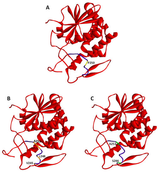 Crystal structures of ricin A-chain. PDB protein data bank (code 2AA1). Whole ricin A-chain (RTA) structures are marked in red. The hydrophobic region (Val245 to Val256) is indicated in purple. Several residues have been selected within the hydrophobic region and modified to obtain RTA with changed secondary structure or changed hydrophobicity. These residues are: (A) P250 (marked in yellow) has been modified (P250A) to produce RTA with a changed secondary structure; (B) V245, L248, I252, and A253 (marked in orange) have been modified (V245S, L248N, I252N, A253S) to obtain RTA with decreased hydrophobicity (RTA DHF); (C) S246 and A253 (marked in green) have been changed (S246V, A253V) to obtain RTA with increased hydrophobicity (RTA IHF).