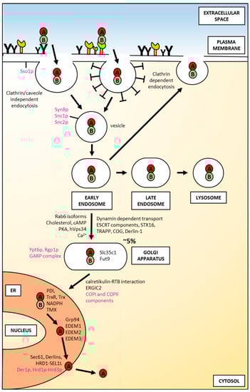 An overview of factors involved in the intracellular transport of ricin in mammalian and yeast cells. Yeast proteins are shown in magenta; mammalian proteins are shown in black. For a detailed description, please see the text.