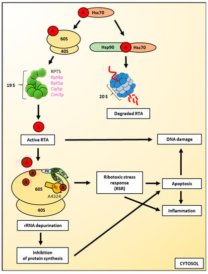 Cytotoxic action of ricin on cells. Binding to cytosolic chaperones, ribosome-mediated refolding and interactions with ribosomal and proteasomal factors are pathways by which ricin A-chain can obtain its active form. However, ricin A-chain is partially degraded by proteasomes. Active ricin A-chain is an N-glycosidase that removes a universally-conserved adenine at position 4324 from the α–sarcin-ricin loop (SRL) of the rRNA present in the large ribosomal subunit. The interaction of ricin A-chain with the large ribosomal subunit is facilitated by the ribosomal stalk structure, composed of P0, P1 and P2 proteins. The damage of the 28S rRNA by ricin leads to the inhibition of protein synthesis and triggers the ribotoxic stress response (RSR). Both pathways can induce apoptosis and further inflammation. Ricin A-chain can also directly induce DNA damage. Yeast proteins are shown in magenta; mammalian proteins are shown in black. 20S refers to the core particle, whereas 19S refers to the regulatory particle of the proteasome. For a detailed description, please see the text.