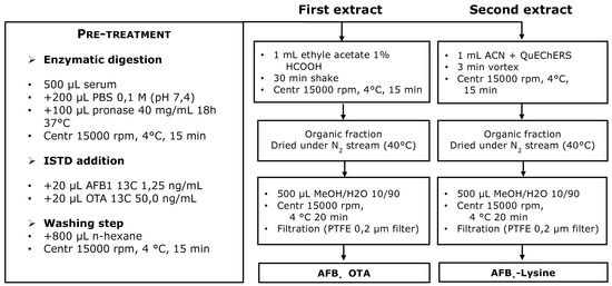 Serum samples were allowed to reach room temperature. Five hundred µL were diluted with 200 µL of phosphate-buffered saline PBS (pH = 7.4) and mixed with pronase solution (100 µL, 40 mg/mL) and incubated at 37 °C for 18 h. After enzymatic treatment with pronase, labeled internal standard solutions were added (20 µL U-[13C17]-AFB1 5 ng/mL; 20 µL U-[13C20]-OTA 5 ng/mL). Serum sample was shaken for 5 min with 800 µL of n-hexane and centrifuged at 15,000 rpm for 15 min at 4 °C. Aqueous fraction was transferred with a syringe in a 2 mL Eppendorf tube and the sample was extracted with 1 mL of acidified ethyl acetate (1% formic acid) by shaking for 30 min. The sample was centrifuged at 15,000 rpm for 15 min at 4 °C and the supernatant transferred in a collection amber vial. One mL of ACN was then added to the serum residue, sample is vortexed and mixed with 300 mg of QuEChERS (DisQuE, Waters, Milford, MA, USA). The sample was centrifuged at 15,000 rpm for 15 min at 4 °C and the organic layer transferred in a separate collection vial. Both collected organic phases were evaporated to dryness, reconstituted in 500 µL of MeOH:H2O 10:90 v:v and 20 µL injected into UHPLC-HRMS system for the LC-MS/MS analysis. The described analytical procedure is outlined in Figure 1.