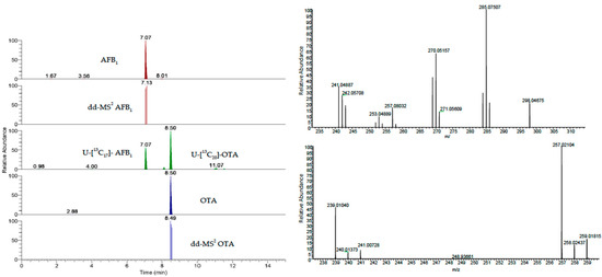From top left, the extracted ion current of AFB1 and its data dependent, the extracted ion currents of the labelled internal standard of AFB1 and OTA and the extracted ion current of OTA and its data dependent. On the right side, the mass spectra of AFB1 (top) and OTA. The data are from the injection of a spiked serum sample (AFB1 25 pg/mLserum, OTA 2500 pg/mLserum).