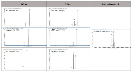 Product ion spectra of AC, MA, HA, BCA, BHA, BMA, and Berberine (IS).