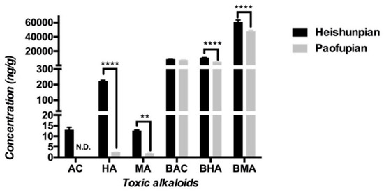 Contents of the six toxic alkaloids in Heishunpian and Paofupian are depicted in Figure 3. It was found that the content of BMA was the highest among all six toxic alkaloids and the content of HA was the highest among the studied three DDAs. It was also noted that total contents of MDAs were much higher than those of DDAs in both Fuzi preparations with the contents of MDAs 50–5000 times of DDAs in Heishunpian and 2000–30,000 folds of DDAs in Paofupian. Comparing the toxic alkaloids contents in two Fuzi preparations, higher contents of toxic alkaloids were detected in Heishunpian than that in Paofupian, especially for HA, MA, BHA and BMA. The content of AC was 12.94 ng/g in Heishunpian, while it was not detectable in Paofupian.