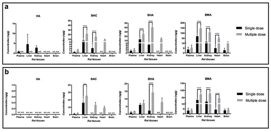 Profiles of HA, BAC, BHA, and BMA in rat plasma and different organs at 2 h after both bolus dose and 15-day consecutively dose of (a) Heishunpian and (b) Paofupian at 30 g/kg to rats (n = 8, ** p < 0.01, **** p < 0.0001, N.D.: not detected, below the listed LLOQ of each rat tissue in Table A1).