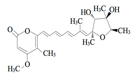 Citreoviridin (CTVD) (Figure 1) is a mycotoxin produced as a secondary metabolite of Penicillium citreonigrum, Aspergillus terreus, and Eupenicillium ochrosalmoneum [1]. CTVD has previously been detected in food including rice in various areas [2,3,4,5,6]. Contamination with CTVD, well-known as yellow rice toxin, often occurs due to inappropriate management after harvest [7]. The toxicity of CTVD is mainly accompanied by ascending paralysis, central nervous system disturbance and respiratory arrest, and fatal adverse effects may occur [8]. Because CTVD is mainly found as a contaminant in rice, these properties of CTVD can be a serious problem in countries in which people consume rice as a staple food such as Thailand, Brazil, and Japan.