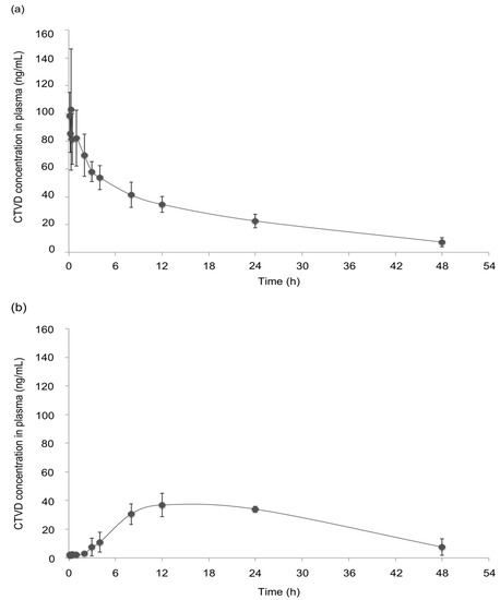 The CTVD concentration–time profiles in the plasma of swine after IV and oral administration (PO). CTVD (0.1 mg/kg·BW) was administered intravenously (a) and orally (b). Control plasma was obtained on the day before administration. Values are presented as the mean ± standard deviation (SD). n = 4 in both groups.
