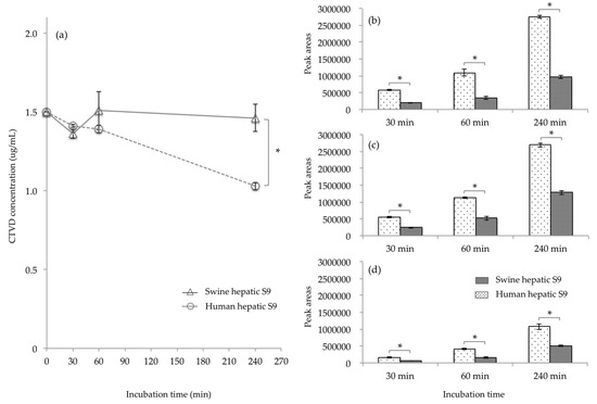 The comparison of the CTVD concentration and the main metabolites in humans and swine, obtained by incubating of CTVD with hepatic S9 fractions of humans and swine. CTVD (1.5 µg/mL) was incubated with the hepatic S9 fractions of humans and swine supplemented with NADP as a coenzyme. The CTVD concentrations at 30, 60, and 240 min after the start of incubation are described (a). The main metabolites produced in humans and swine are shown in (b–d). The metabolites in humans and swine at each time-point were compared based on the mean peak area of each metabolite. (b–d) show the mean peak areas of hydroxylation and methylation, desaturation, and dihydroxylation derivatives, respectively, following incubation with human or swine hepatic S9, respectively. Values are presented as the mean ± SD. Asterisks indicate a statistically significant difference (p < 0.05).