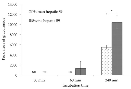 A comparison of the CTVD glucuronidation during incubation with human and swine S9 fractions supplemented with UDPGA. CTVD (1.5 µg/mL) was incubated with human and swine hepatic S9 fractions supplemented with UDPGA as a coenzyme. The amount of CTVD glucuronide at 30, 60, and 240 min was measured by Q-TOF. The metabolites in humans and swine at each time-point were compared based on the mean area of each metabolite. Values are presented as the mean ± SD. Asterisks indicate a statistically significant difference (p < 0.05). ND, not detected.