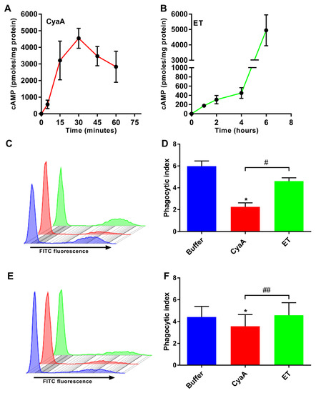CyaA- and ET-provoked cAMP elevation hijacks signal transduction pathways and interferes with the opsonophagocytosis and bactericidal activities of phagocytes [16,20,22,34,35,36,40]. We thus used flow cytometry to compare the effects of CyaA and ET action (at similar overall cellular cAMP levels) on binding and internalization of serum-opsonized zymosan (SOZ) particles by THP-1 monocytes. As shown in Figure 1, incubation of THP-1 cells with CyaA for 30 min yielded ~5000 pmol of cAMP per mg of total cell protein (Figure 1A) and resulted in strong inhibition of phagocytic uptake of fluorescent SOZ particles by the cells (Figure 1C), which is reflected by the calculated phagocytic index (Figure 1D). In contrast, incubation of THP-1 cells with ET for 6 h, which also yielded ~5000 pmol of cAMP per mg of total cell protein (Figure 1B), had no significant effect on the phagocytic capacity of the cells (Figure 1C), which is reflected in the calculated phagocytic index (Figure 1D). Furthermore, when CyaA and SOZ particles were added simultaneously to THP-1 cells, the CyaA toxin was able to significantly inhibit the binding and uptake of fluorescently labeled SOZ particles (Figure 1E,F). In contrast, ET had no effect when added simultaneously with SOZ (Figure 1E,F). These results show that cAMP intoxication of THP-1 cells by CyaA occurs rapidly and efficiently inhibits opsonophagocytosis, while ET-provoked cAMP intoxication occurs gradually and is inefficient at inhibiting the binding and uptake of opsonized targets.