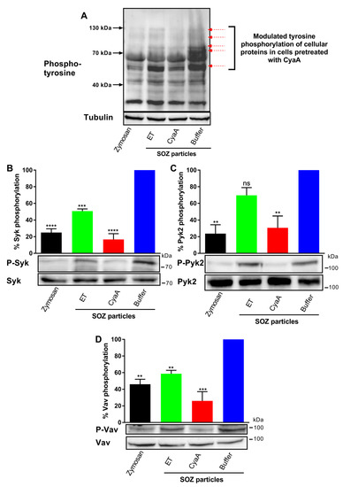To corroborate this observation, we next examined the activation of the cytoplasmic non-receptor tyrosine kinase Pyk2, which is activated by signaling through phagocytic receptors or upon increase of cytosolic calcium concentration. Pyk2 activation is downstream to activation of the Syk and Src kinases and regulates the Rho/WASP pathway of actin-polymerization [10,11,42,43]. In line with the trend observed for Syk, preincubation of THP-1 cells with CyaA led to near complete inhibition of Pyk2 phosphorylation in cells incubated with SOZ particles (Figure 2C), whereas preincubation of cells with ET yielded only a modest inhibition of Pyk2 phosphorylation, which was not statistically significant.