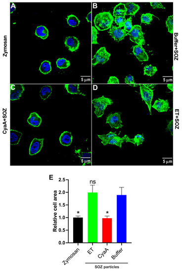CyaA- and ET-provoked cAMP signaling differentially affects actin cytoskeleton remodeling in THP-1 monocytes. 3 × 106 THP-1 cells were seeded on glass cover slips and incubated with unopsonized zymosan particles (A), or after preincubation with buffer (B), CyaA for 30 min (C), or ET for 6 h (D) with SOZ particles (30 min, 37 °C). After fixation, permeabilization, and staining for F-actin with TRITC-conjugated phalloidin (green) and for nucleic acid with DAPI (blue), the cells were imaged using confocal microscopy. All the images were processed using ImageJ software and are representative of two independent experiments. (E) The area occupied by the cells was measured from the microscopy images and plotted as relative cell area. Data represents mean with SEM, derived from six images analyzed for each experimental group from two independent experiments, where at least 3 cells were measured in each image (N ≥ 18). p values were determined using one-way ANOVA; *, p < 0.05; ns, not significant, for results compared with buffer-treated cells incubated with SOZ particles.