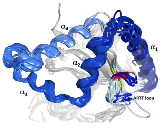 The α-lobe in C3-like toxins. Superposition of six C3-like toxins showing a compact N-terminal substructure that encompasses four α-helices. The ARTT loop (ADP-ribosyl-turn-turn) is a catalytic region that is responsible for the target substrate recognition and is shown at the bottom right of the overlaid structures. The superposed structures include C3 exotoxin (PDB:1G24) and C3bot2 (PDB:1R45) from C. botulinum, C3lim (PDB:3BW8) from C. limosum, C3cer (PDB:4XSG) from B. cereus, C3larvin (PDB:4TR5) from P. larvae, and C3stau2 (PDB:1OJQ) produced by S. aureus.
