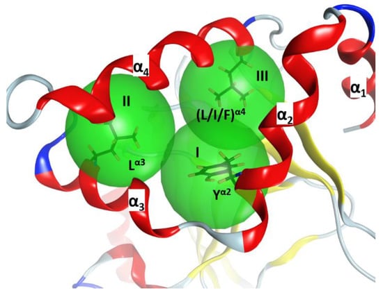 The α-lobe stability. α2–α4 superstructure of C3larvin (PDB: 4TR5), showing three hydrophobic clusters (depicted as green spheres) centered at three key residues. The structural “clusters” for the α2–α4 superstructure are designated as I, II, and III and the superstructure is framed by three α helices (α1, α2, and α3).