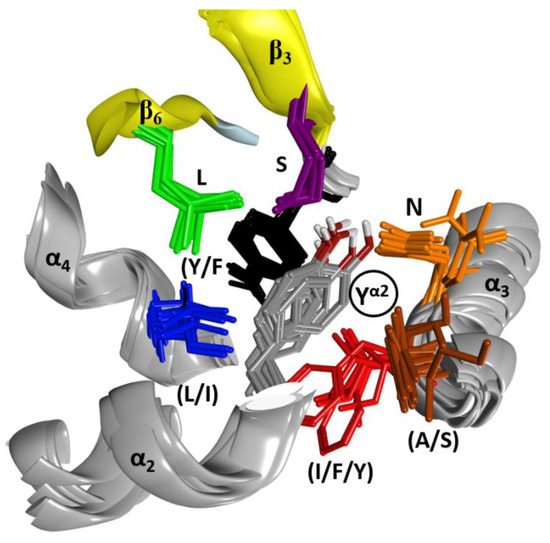 Interactions in ClusterI of the α2–α4 superstructure. The cluster of residues around the conserved Tyrα2 (circled label; grey residue) is shown in this set of six overlaid C3 structures. The side- chains are shown for Tyr/Pheβ2,3 (black), Serβ3 (mauve), Leuβ6 (green), Leu/Ileα4 (blue), Ile/Phe/Tyrα3 (red), Ala/Serα3 (brown), and Asnα3 (orange).