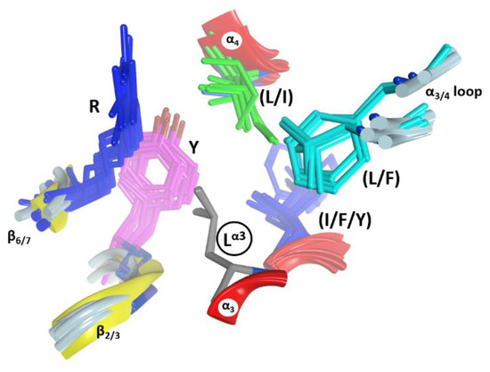 In C3-like toxins, the conserved Leuα3 is part of the (NLR)α3 motif and is the center of a second cluster of hydrophobic interactions, “clusterII” that links α3 and α4 and connects them to other elements (Figure 6). In this cluster, Leuα3 interacts with (Leu/Ile)α4, with some residues in the α3/4-loop, and with two other regions that act as hinges between both β-sheets–the conserved Tyr β2/3 and the conserved Arg β6/7 (part of the (LPR) β6/7 motif). This cluster is structurally well defined in C3-like toxins as evidenced by superposing the structures on Leuα3 (grey residue in Figure 6). It is remarkable how identical this configuration (i.e., same side-chain torsion angles) is for these clustered residues. Leuα3 is conserved in Plx2A, the C2-like toxins (C2C-domains, but not the C2N-domains) and in most of the non-PT-like toxins (except, for example, the TccC3 and TccC5 toxins) [45]. This observation suggests an active role for Leuα3 in the stability of the α3-motif, which is relevant for the binding of the NAD+ substrate, rather than serving a pure structural role in the lobe stability.