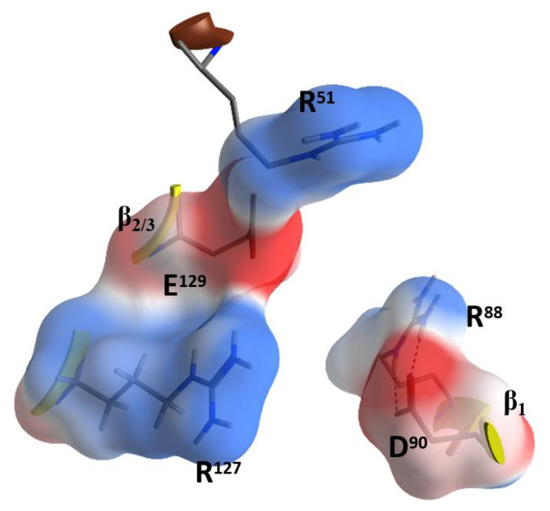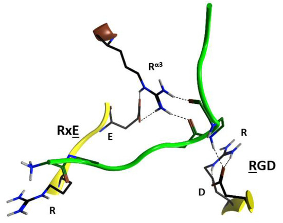 Notably, the RxE motif (TxE in C3cer) is only present in the C3-etoxins. Thus, active-site residues, RGD (and likely also Rα3 and RxEβ2), while important for interaction with NAD+ for catalysis, have the role of binding vimentin on the membrane surface of the host cell. This dual function may be rationalized because these two activities are manifested in different compartments (i.e., the cytoplasm for enzymatic activity and the extracellular space for the vimentin recognition) and in different stages of the intoxication process. Therefore, considering that C3-like toxins correspond to a “minimal” toxin, then Asp90 and Arg127 (in C3bot1) may have evolved to use the invariant Arg51, Glu129, and Arg88 residues to bind a required membrane component for toxin internalization. Validation of the role of these residues in protein–protein interactions lies in the crystal contacts of a C3larvin fragment—of a symmetrically related molecule–docked into the NAD+-binding pocket in the C3larvin crystal structure (PDB: 4TR5) (Figure 8).