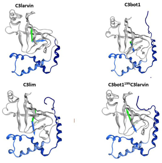 The eight known C3-like toxins do not possess a specialized cell binding/translocation component or domain for access/entry into their target host cells, and the details on the mechanism and molecular determinants involved in the toxin internalization await further characterization (for a recent review see Rohrbeck, 2016 [47]). This is relevant for all C3-like toxins except C3stau toxins (C3stau1, C3stau2 and C3stau3), since S. aureus infects the host cell and releases the toxins into the cell cytoplasm [29]. Thus, C3bot1, C3bot2, C3lim, C3cer, and C3larvin toxins will be referred to collectively as “C3-etoxins” (with “e” after extracellular).