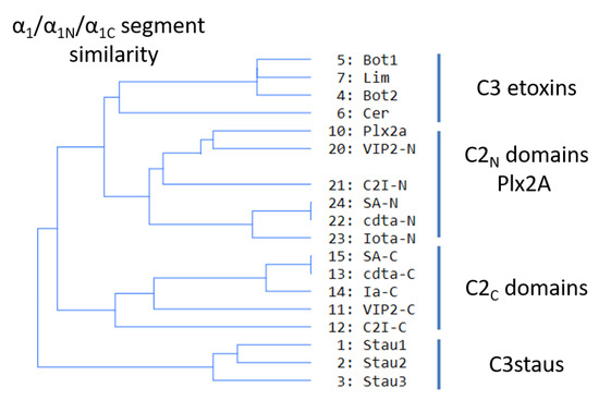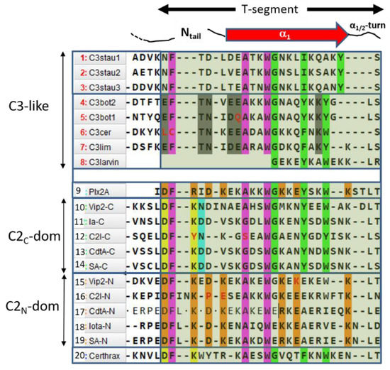 Sequence-function analysis of the T-segment—a structure-based, multiple-sequence-alignment (MSA) enhanced with the pattern of molecular interactions—was performed for the Ntail-α1 segment of the C3-like toxins, Plx2A, and the C2N- and C2C-domains (Figure 10). With the previous alignment and taking Plx2A toxin as the “master” sequence because it has the shortest Ntail among the aforementioned toxins, the “T-segment” (“T” after terminal) was identified that comprises five residues of the Ntail, the α1 helix, and the α1/2-turn (Figure 10). Subsequently, a cluster analysis based on the similarity of the T-segment residues was performed on this toxin group, excluding C3larvin because it lacks the Ntail and has a truncated α1 (Figure 11).