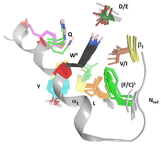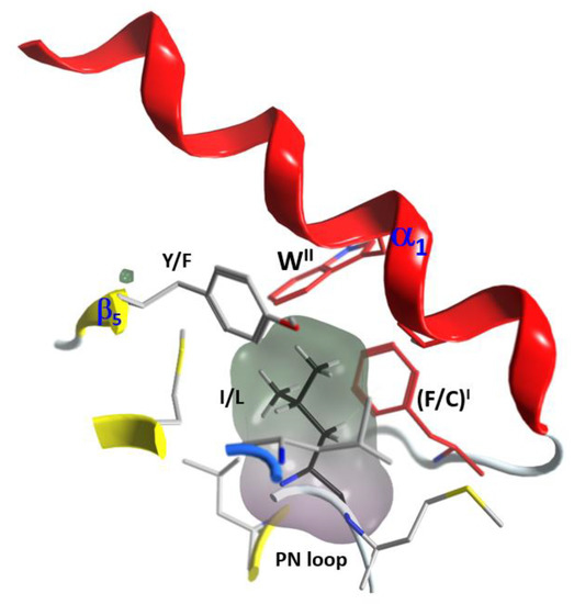 (1) The “S-motif”, FI–(A/G)–WII, which is contained in the three S1−S3 consensus sequences motifs (fuchsia residues in Figure 10). The S-motif appears in all T-segments (including C3staus) and therefore likely participates in stabilizing the T-segment and neighboring regions (“S” after structure). In effect, PheI (Cys in C3cer) stabilizes the coiled Ntail segment with β1 in a β-like configuration. In turn, (Phe/Cys)I along with Ala/Gly and the conserved TrpII orient the α1 helix of the α-lobe by means of a network of hydrophobic and H-bond interactions (Figure 12). In particular, the interaction of the S-motif residues with both semi-conserved (Iso/Leu)PN in the PN-loop, and with (Tyr/Phe) β5 in the ARTT-loop (Figure 13) is relevant and will be discussed later.