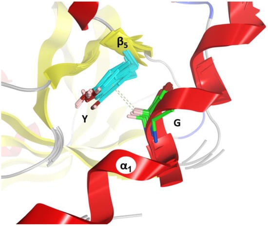 (2) The “C-motif”, G–(Y/F)III–(Y/W)IV is found in the S1 and S2 consensus sequences and features residues not found in the S-motif (green residues in Figure 10). This motif only appears in catalytic domains/toxins, including C3stau’s (with Ile instead of (Y/F)II) and C3larvin, and therefore might be related to the stabilization of catalytic residues (“C” after catalytic). In effect, the conserved Gly residue fits into a small space and interacts/stabilizes the conserved Tyrβ5 (Phe in C2IC) adjacent to the ARTT-loop by a H-Pi-type H-bond (Figure 14). The last two aromatic residues in the motif, (Tyr/Phe)III and (Tyr/Trp)IV, in addition to stabilizing the α1–α2 superstructure, interact with conserved residues at or adjacent to the ARTT-loop (not shown). Thus, the C-motif might have evolved along with the ARTT-loop and any key determinant might have been lost in the co-evolution of the C2N-domains with the “atrophy” of catalytic signatures in the ARTT-loop.