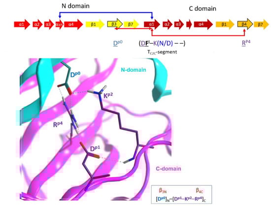 (4) The “I-motif”, D–K(N/D), has residues in the TC2C-segments that are not included in the previous motifs (yellow and cyan residues in Figure 10) and this motif participates in the inter-domain stabilization (“I” after interdomain). This motif can be defined by three positions (p1...p3) according to Dp1–Kp2(N/D)p3. The p1 and p2 positions of the I-motif might have evolved along with a residue in the β3N-strand (additional position p0) and a residue in the β4C-strand (additional position p4), to form a quaternary cluster, [Dp0]N−[Dp1−Kp2−Rp4]C that stabilized both domains (Figure 15). In agreement with the previous assertion, Aspp0 is conserved in β3N and does not appear in β3C; Argp4 is invariant in β4C and does not appear in β4N. Incidentally, Aspp0 and Argp4 are absent in equivalent elements (strands β3 and β4, respectively) of single-domain toxins. In addition, the 3rd position of the I-motif, (N/D)p3, makes effective contacts with the α3/4-loop in the C2N-domains (α3/4N-loop) to stabilize both domains (see the next section).