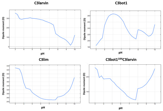 pH-dependence of the protein dipole-moment of C3 toxins. The pH profile of the electrical dipole-moment is shown for three C3-like toxins and for the chimeric protein consisting of the fusion of the N-terminus of C3bot1 with C3larvin toxin.