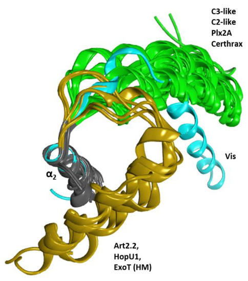 Conformations of the α1 helix. Superposition of several toxins of the CT-group for the α2 helix (gray ribbons) showing three conformation clusters for the α1 helix. These clusters are the canonical conformation in green, the altered conformation of Vis in cyan, and the folded conformation of HopU1, Art2.2, and ExoT (HM) in ochre.