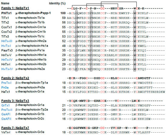 Sequence alignment of PhlTx1 with other spider toxins. Highly conserved cysteines are indicated in red and probable cysteine pairing, according to the inhibitory cysteine knot motif and the consensus sequence for NaSpTx-1 family of toxins, is indicated at the top with black lines. Percent conserved residues are indicated on the right. Shaded boxed residues correspond to the consensus residues of NaSpTx-1 toxin sequences. The lower homology with toxins from NaSpTx-2, NaSpTx-3 and NaSpTx-7 families are also shown. Toxins that are in blue have been compared in terms of activity on the Nav1.7 channel with PhlTx1 (see Figure 7).