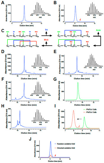 Comparative chemical synthesis of PhlTx1 following the random oxidative folding or the directed disulfide bond formation strategies. (A) Analytical RP-HPLC of the purified linear PhlTx1 meant to be produced by random oxidative folding (only Trt protecting groups for the 6 cysteine residues during chemical synthesis). Inset: MS spectrum of synthetic linear PhlTx1. [M + 4H]4+ of 1016.45. (B) Analytical RP-HPLC of the folded oxidized PhlTx1. Red arrow possibly indicates the second conformer of PhlTx1 that is present. Inset: MS spectrum of purified PhlTx1. [M+4H]4+ of 1014.94. (C) Schematic procedure employed for the directed disulfide bond formation strategy. (D) Analytical RP-HPLC of the crude linear PhlTx1 used for the directed disulfide bond formation strategy. Inset: MS spectrum of the synthetic compound with the Acm and Mob protecting groups. [M + 4H]4+ of 1111.99. (E) Analytical RP-HPLC of crude PhlTx1 with its first disulfide bridge. Inset: corresponding MS spectrum of the compound. [M + 4H]4+ of 1111.50. (F) Analytical RP-HPLC of crude PhlTx1 with its two first disulfide bridges. Inset: corresponding MS spectrum of the compound. [M + 4H]4+ of 1075.47. (G) Analytical RP-HPLC of purified PhlTx1 with its two first disulfide bridges. (H) Analytical RP-HPLC of crude PhlTx1 in its fully folded configuration. Inset: corresponding MS spectrum of the compound. [M + 4H]4+ of 1014.94. (I) (G) Analytical RP-HPLC of purified two-disulfide bridged (2db) and three-disulfide-bridged (3db) PhlTx1 to illustrate the important reduction of hydrophobicity of the peptide upon removal of the Mob protecting groups. (J) Coelution of purified PhlTx1 produced by random oxidative folding with that produced by a directed disulfide bond formation strategy.