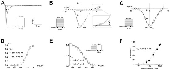 We further characterized the inhibition of Nav1.7/β1 currents by PhlTx1. The residual inward current after at 1 µM PhlTx1 addition seems to occur without any alteration in channel kinetics (Figure 5A). Outward sodium currents at depolarizing voltages (+100 mV) were also blocked, as assayed with the help of tetrodotoxin (TTX; 50 nM) which physically occludes the pore (Figure 5B). Furthermore, Nav1.7/β1 inhibition did not seem to be very voltage-dependent, since the reduction of sodium currents at more hyperpolarized voltages (−70 to −30 mV) was similar to the reduction of sodium current at more depolarized potentials (−20 to 60 mV). The Nav1.7/β1 gating parameters, before and after addition of 1 µM PhlTx1 (n = 4; Figure 5C), are not affected (p < 0.05; see Figure 5D). Again, no alteration in steady-state inactivation or Erev was seen (Figure 5B,E). In order to obtain the IC50 value of PhlTx1 on Nav1.7/β1, expressed in Xenopus laevis oocytes, the percentage of toxin-induced block obtained at a stimulus frequency of 0.3 Hz was plotted against the concentration of toxin used and a fit with the Hill equation yielded a value of 260 ± 46 nM with a Hill coefficient = 1.3 (Figure 5F).