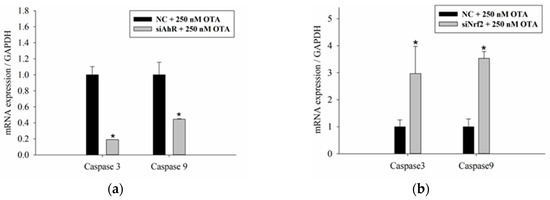 Effects of AhR and Nrf2 silencing on oxidative stress and apoptosis. HepG2 cells were transfected with (a) siAhR or (b) siNrf2 for 24 h, and then cultured for 48 h with 250 nM OTA. The expression levels of caspase 3 and caspase 9 were determined by real-time PCR. (c) Following AhR silencing and 500 nM OTA treatment, ROS levels were measured by H2DCFDA staining. Data are expressed as the mean ± SD of three independent experiments. * p < 0.05 siRNA compared with the NCs.