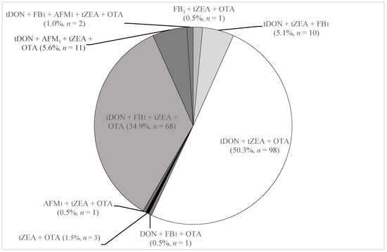 The occurrence of multiple mycotoxins and metabolites in pig urine is reported in Figure 1. The most common combinations were total DON + total ZEA + OTA (50.3% of samples) followed by total DON + FB1 + total ZEA + OTA (34.9% of samples) (Figure 1). Each of the seven other combinations occurred in less than 6% of urine.