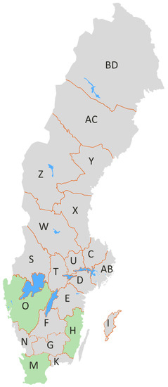Map of the Sweden showing from which county the pig urine samples were collected. The West region is represented by Västra Götaland county (O), the South region is represented by Skåne county (M) and the East region is represented by Kalmar county (H). The names of other counties are reported here https://www.iso.org/obp/ui/#iso:code:3166:SE.