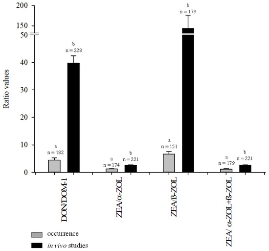 Ratios of DON/DOM-1, ZEA/α-ZOL, ZEA/β-ZOL and ZEA/α-ZOL + β-ZOL in the urine of pigs chronically exposed to naturally contaminated feeds (grey bars) [7,11,13] and pigs exposed for a short period to relatively high doses of DON and/or ZEA (black bars) [6,7,19,20,21,22,23]. a,b Different letters within each couple of bars represent statistically significant difference (p < 0.05).