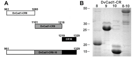 DvCad1-CR8, CR9, CR10, and CR8-10 regions of Diabrotica virgifera virgifera midgut cadherin (A), were expressed in Escherichia coli and the inclusion peptides, separated by 12% SDS-PAGE (B).