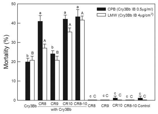 Bioassays of the DvCad1-CR8, CR9, CR10, or CR8-10 inclusions with Cry3Bb against the Colorado potato beetle (CPB) and the lesser mealworm (LMW). Suspensions of Cry3Bb inclusions (0.5 µg/mL), with or without CR inclusions (5.0 μg/mL), at a toxin/peptide mass ratio of 1:10, were sprayed onto the excised potato leaves. Suspensions of Cry3Bb inclusions (4 μg/cm2), with or without single DvCad1-CR inclusions (40 μg/cm2), at a toxin/peptide mass ratio of 1:10 were fed to the LMW larvae in a surface overlay bioassay. Larval mortality was scored on day 3. Points annotated with the same letter were not significantly different. Lowercase letters compare CPB, while uppercase letters compare LMW.