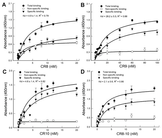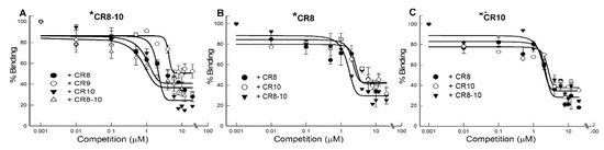 Competition for a shared CR binding site on Cry3Bb was analyzed by measuring the labeled-CR fragment binding to Cry3Bb in the presence of increasing concentrations of unlabeled CR fragment. In Figure 4A, biotinylated-DvCad1-CR8-10 (10 nM) was competed by increasing the amounts of unlabeled CR8, CR9, CR10, or CR8-10. Binding of biotin DvCad1-CR8-10 to Cry3Bb was displaced by increasing concentrations of the unlabeled CR8, CR10, and CR8-10 peptide, which evidenced that CR8 and CR10 acted interchangeably in reducing CR8-10 binding to Cry3Bb. A higher concentration of CR9 was required before a reduction of biotin-DvCad1-CR8-10 binding was measured and the extent of competition was found to be less than that with CR8, CR10, or CR8-10 peptides. To further test the similarity of interactions between CR8 and CR10 peptides with Cry3Bb, we biotinylated CR8 and CR10, and measured the capacity of increasing amounts of CR8, CR10, and CR8-10, to compete binding to Cry3Bb. As shown in Figure 4B,C, the competition curves were similar for biotin-DvCad1-CR8 and biotin-DvCad1-CR10. These competition results agreed with the saturation binding results, revealing similar affinities for the CR8 and CR10 peptide binding to Cry3Bb, and additionally suggest that they bind the same site(s) on Cry3Bb.