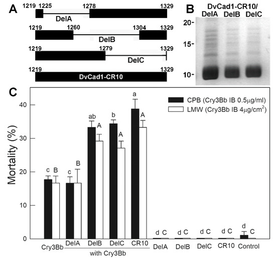 Diagram of DvCad1-CR10 deletion constructs (A), peptides separated by SDS-PAGE (B), and bioassays with Cry3Bb and CR10 deletion peptides (C). Details of the bioassays were as in Figure 1. Larval mortality was scored on day 3. Points annotated with the same letter were not significantly different. Lowercase letters compared the CPB, while the uppercase letters compared the LMW.