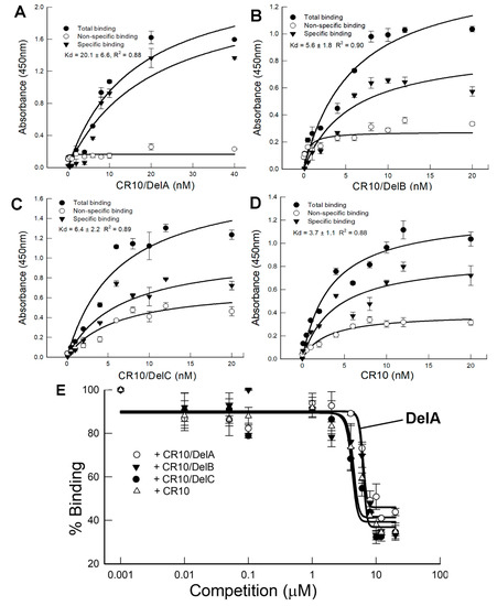Binding of the biotinylated DvCad1-CR10/DelA (A), CR10/DelB (B), CR10/DelC (C), and CR10 (D) to Cry3Bb was determined by an ELISA binding assay. Microtiter plates coated with Cry3Bb were incubated with increasing concentrations of biotinylated CR10 peptide alone or with a 1000-fold molar excess of the unlabeled homologous peptide, to determine specific binding of Cry3Bb. (E) shows binding of biotin-CR10 to Cry3Bb, with increasing concentrations of CR10 or CR10/Del peptides.