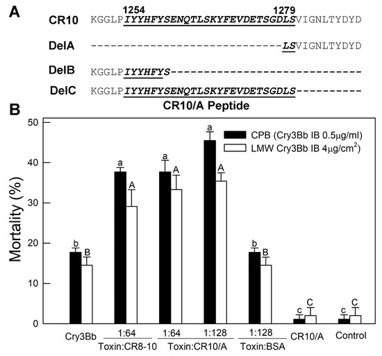 Reduced Cry3Bb binding and a lack of toxicity enhancement by CR10/DelA, identified 51-aa residues deleted from fragment CR10 as being important to the Cry3Bb interactions. Figure 7A shows the synthetic 26-aa residue CR10/A peptide used to directly test the toxicity enhancement function for this small region of CR10. Fragments CR10/DelB and DelC, which contained the overlapping segments of the CR10/A region and retained a high affinity binding and synergy of Cry3Bb toxicity, were also considered in the design of the CR10/A (Figure 7A). Synthetic CR10/A peptide was tested with an amount of Cry3Bb that alone caused about 20% mortality to CPB and LMW. As shown in Figure 7, CR10/A peptide at a 1:64 (toxin:peptide) molar ratio, enhanced Cry3Bb toxicity to both CPB and LMW, and similarly to CR8-10. The increased synergistic effect at a 1:128 (toxin:peptide) molar ratio was not statistically significant. The control bioassay using the BSA showed no synergistic effect with Cry3Bb.