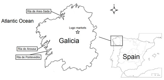 Map of Spain showing the location of Galicia (North-West Spain), mussel farms areas (Ría de Ares-Sada, Ría de Arousa, and Ría de Pontevedra) and the place from where the mussels were purchased (Lugo).