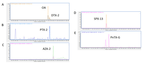Chromatograms of okadaic acid (OA) and dinophysistoxin-2 (DTX-2) (A), pectenotoxin-2 (PTX-2) (B), Azaspiracid-2 (AZA-2) (C), 13-desmethyl spirolide C (SPX-13) (D), and pinnatoxin-G (PnTX-G) (E), which are found in commercial mussels (A–D) Sample No. 5; (E) Sample No. 11.