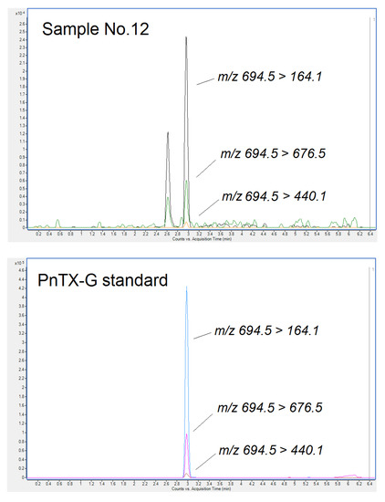 Chromatogram of specific multiple reaction monitoring (MRM) transitions for PnTX-G (m/z 694.5 > 164.1, m/z 694.5 > 440.1, and m/z 694.5 > 676.5) in Sample No. 12 and in the PnTX-G standard at a concentration of 1 ng/mL in methanol.