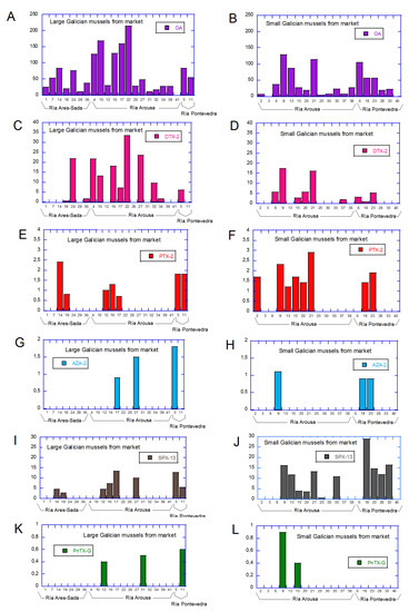 The toxins levels found in the Galician commercial mussels (Table 2) are represented in Figure 4, sorted by toxin, mussel size, and place of collection (Ría). Graphs A, C, E, G, I, and K belong to the large Galician mussels (a total of 22 samples) and B, D, F, H, J, and L represent small ones (a total of 19 samples). Comparing the toxin levels for both sizes, the values were found to be quite similar for PTX-2 (Graphs E and F), AZA-2 (Graphs G and H), SPX-13 (Graphs I and J), and PnTX-G (Graphs K and L). However, it seems that OA (Graphs G and H) and DTX-2 (Graphs I and J) had accumulated in larger amounts in large mussels. For example, the maximum OA level found in small mussels was 128.6 µg/kg (Sample No. 9), yet, 5 large mussel samples were in the range 127.2–214 µg/kg. Additionally, the maximum DTX-2 level in mussels of smaller sizes were 17.4 µg/kg, while 5 samples from the large mussels exceeded this value (up to almost double, 33.5 µg/kg in Sample No. 22). Since the number of samples from each collection place was not similar, a proper comparison between Rías was not possible (7 samples from Ría Ares-Sada, 26 samples from Ría Arousa, and 8 samples from Ría Pontevedra). However, it is worth mentioning that neither AZA-2 nor PnTX-G were found in Ría Ares-Sada and only 2 samples from this Ría showed low SPX-13 levels (2.6 µg/kg Sample No. 19 and 4.4 µg/kg Sample No. 14). On the contrary, SPX-13 was found in higher levels in the remaining two Rías, since it was detected in 6 out of the 8 samples in Ría de Pontevedra, at levels of 5.4 µg/kg (Sample No.11) to 28.9 µg/kg (Sample No. 18), and was detected in Ría Arousa in 11 out 26 samples in the range, 0.6 µg/kg (Sample No. 25) to 16.2 µg/kg (Sample No. 9). PTX-2, OA, and DTX-2 amounts were more homogeneous, although higher levels were always found in mussels from Ría Arousa—2.9 µg/kg PTX-2 in Sample No. 21, and 214 µg/kg OA and 33.5 µg/kg DTX-2 in Sample No. 22.