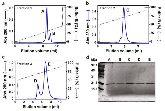 Five actinoporins from Actinia fragacea were purified as described in Materials and Methods. Elution of Actinia fragacea venom through an SP Sepharose column rendered three hemolytic peaks [22]. These peaks were loaded in a Mono S 5/5 column, obtaining five elution peaks that we termed A, B, C, D, and E (Figure 1a–c). In particular, peak C corresponded to the well-characterized toxin fragaceatoxin C (FraC), which was used for comparative purposes in further analyses.