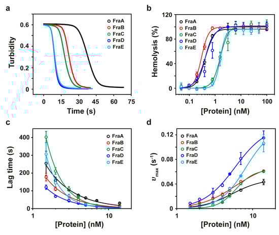 By using a saturating protein concentration (14 nM), additional information of the lytic mechanism was obtained. At this concentration, there was enough protein for the monomers to rapidly bind to lipid molecules and oligomerize. Under these conditions, the rate-limiting step is the insertion of the N-terminal region in the hydrophobic core of the membrane. At saturating concentration, the most active toxins were FraD (lag time = 7 ± 0.8 s; υmax = 115 ± 11 s−1) and FraE (lag time = 7 ± 1 s; υmax = 106 ± 14 s−1), followed by FraC (lag time = 13 ± 0.4 s; υmax = 60 ± 1 s−1), FraB (lag time = 17 ± 0.1 s; υmax = 61 ± 1 s−1), and FraA (lag time = 31 ± 3 s; υmax = 43 ± 4 s−1) (Figure 2c,d and Table 1).